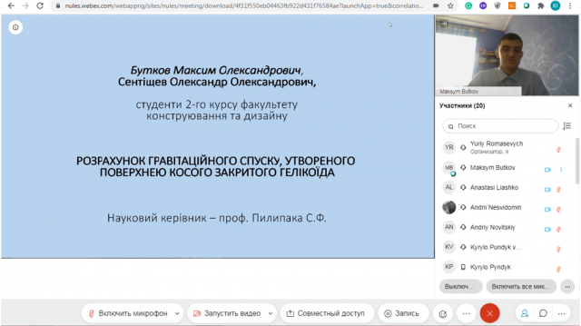 Перші доповідачі – студенти Бутков М.О. та Сентищев О.О. (науковий керівник – професор Пилипака С.Ф.) – розповіли про розрахунок гравітаційного спуску, утвореного поверхнею косого закритого гелікоїда.
