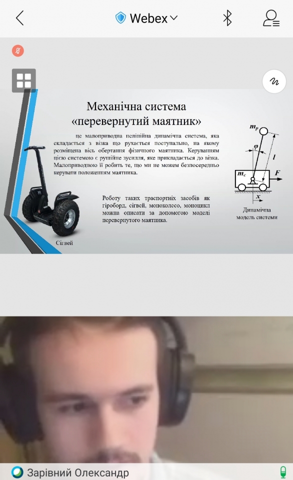 Магістр другого року навчання Зарівний О.Ю. (науковий керівник – професор Ромасевич Ю.О.) розповів присутнім про дослідження динаміки регулювання малоприводної системи „рухомий маятник”. Він показав теоретичну частину роботи та роботу зібраної ним установки, на якій будуть проведені відповідні експерименти.