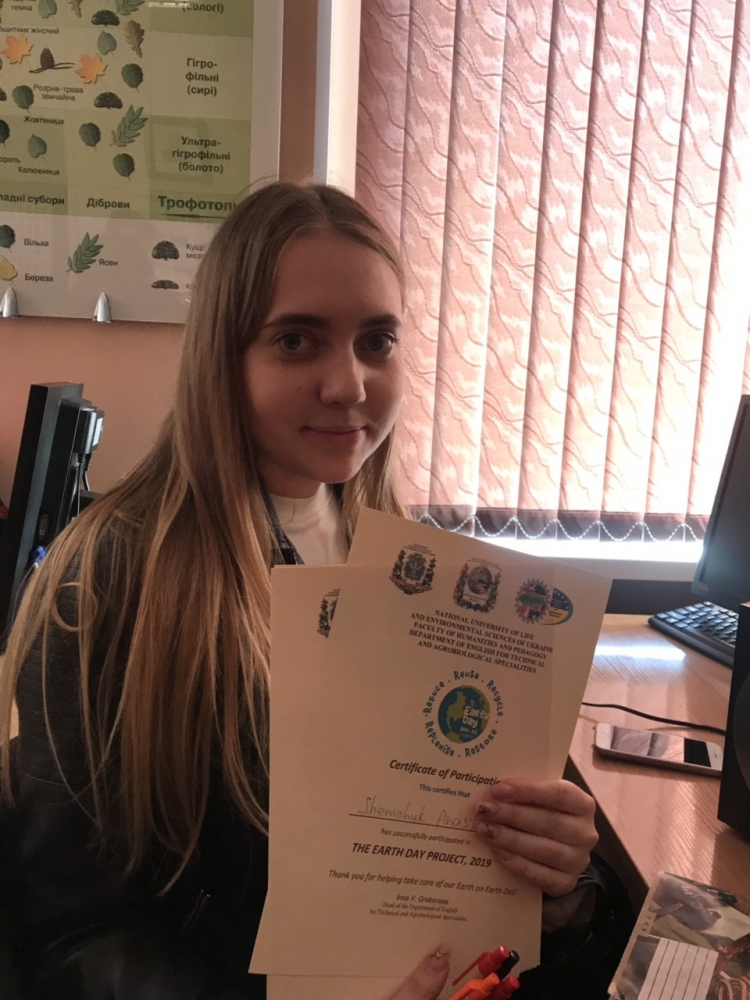 У проекті взяли участь студенти різних спеціальностей, які представили доповіді англійською мовою, візуалізувавши їх самостійно створеними анімованими відео, інфографікою, інтелект-картами з використанням інформаційних технологій. Особливо хотілося б відзначити презентації таких студентів: Юлії Закатей, Олени Ковальчук (гуманітарно-педагогічний факультет, доц. Грабовська І. В.), Анастасії Сук, Анни Тимчій, Діани Русіної, Кирила Трунова (факультет захисту рослин, біотехнологій та екології, доц. Поліщук О. С.), Олександра Заверталюка (ННІ енергетики, автоматики і енергозбереження, доц. Цимбал С. В.), Катерини Кизило, Анастасії Шамчук, Каміли Колодій, Ольги Бурбан (факультет землевпорядкування, доц. Пономаренко О. Г.), Олени Йолдич (факультет конструювання та дизайну, доц. Пономаренко О. Г.), Володимира Кравця, Світлани Мороз (ННІ лісового і садово-паркового господарства, ст. викл. Поліщук А. В.) та Дар’ї Головатої (механіко-технологічний факультет, доц. Яременко Н. В.), які отримали сертифікати та призи. Проведений захід виявився актуальним для студентів технічних і агробіологічних спеціальностей, оскільки зміст їх майбутньої професійної діяльності має безпосереднє відношення до вирішення проблем захисту довкілля.