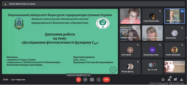 Заслухані доповіді по темах випускових кваліфікаційних робіт були цікаві та різнопланові: «Мікробна очистка ґрунтів від вуглеводневого забруднення» Баштовий Н.О.; «Біологічна характеристика Daedaleopsis confragosa (Bolton) та використання його в біотехнологічних процесах» Волтарніст О.В.; «Використання метаболітів та екстрактів грибів в якості стимуляторів росту томатів» Гвоздік Т.В.; «Удосконалення біотехнологічних процесів вирощування грибів Kuehnero mycesmutabilis (Schaeffer) Singer» Григор’єв Г.Д.; «Біотехнологічні властивості біойогуртів та технології покращення їх харчових властивостей» Діптан В.С.; «Мікроклональне розмноження Стахісу (Stachys) в культурі in vitro» Клюсовська А.О.; «Дослідження впливу фулерену С60 на мікроорганізми» Коваль І.О.; «Вплив бактеріальних добрив на перехід Цезію-137 з ґрунту до рапсу» Кормуш Я.І.; «Біотехнологічні процеси інтродукції якону (Polimnia Sonhifolia)» Ляшук А.М.; «Дослідження фітотоксичності фулерену С60» Малінченко В.А.; «Застосування екологічних біотехнологій очищення побутових відходів в Україні» Наговіцина В.О.; «Біотехнологія отримання біопрепаратів для захисту рослин на основі бактерій Bacillus thuringiensis» Перепелиця Д.А.; «Діагностика і профілактика мікроміцетів в грибних культурах печериці двоспорової Agaricus bisporus (J. Lange) Imbach в біотехнологічному процесі» Пономаренко М.І.; «Біотехнологія у виноробстві: основні принципи та шляхи оптимізації» Сокіл Є.В.; «Культивування лишайників в умовах in vitro» Тимчій А.О.; «Біотехнологічний етап виробництва біогазу та шляхи його оптимізації» Урумов В.А.; «Технологія відбору перспективних кущових інтродуцентів на основі аналізу їхньої потенційної зимостійкості (на прикладі Photiniavillosa DC.)» Чернявський Р.Д.; «Технологія підбору перспективних деревних культур в лісостепу України на основі аналізу їхньої морозостійкості» Шалаєв А.В.; «Підбір і використання біологічно активних речовин із грибів для зниження вірусної інфекції рослин» Шиловська О.Д.