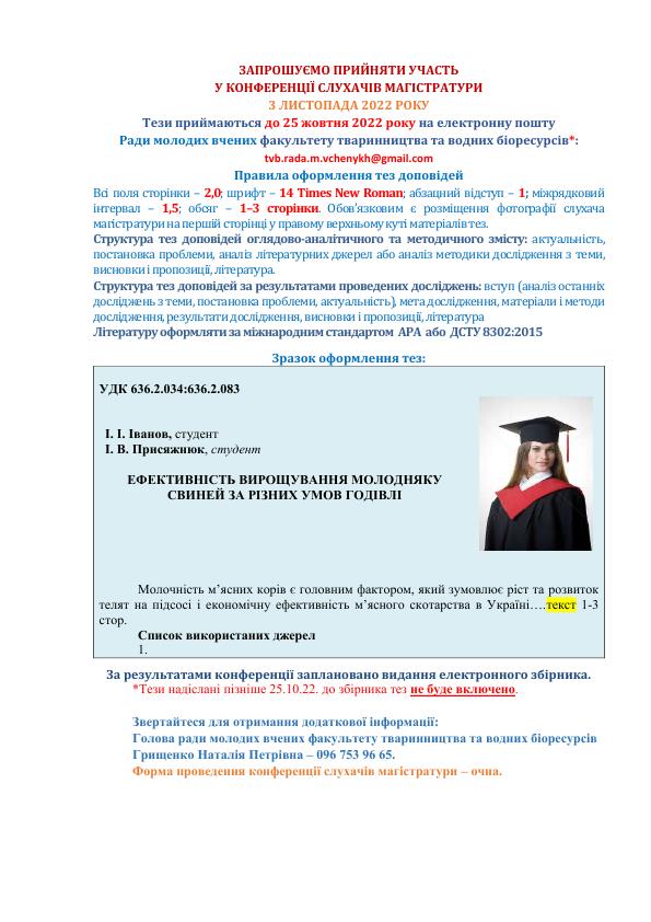 Шановні магістри, запрошуємо вас прийняти участь у постерній конференції за результатами ваших досіджень. Що пройде 3 листопада 2022 року в очному форматі. Для участі вам необхідно подати тези до 25 жовтня 2022 року за вимогами які наведені нижче.