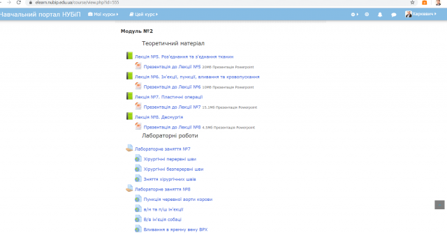 Під час карантинних заходів практична підготовка студентів з дисципліни "Оперативна хірургія, топографічна анатомія та анастезіологія" проходить досить насичено. Так, студенти 2 курсу 8 групи скороченого терміну навчання та 3 курсу 1-5 груп повного терміну навчання під керівництвом викладачів доцента Володимира Ткаченка та асистента Дмитра Тарнавського дистанційно (https://elearn.nubip.edu.ua/course/view.php?id=555) вивчають теми модуля:
