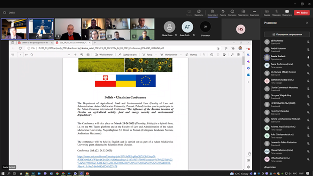23-24 березня 2023 року в Університеті імені Адама Міцкевича (м. Познань, Республіка Польща) у гібридному форматі відбулася Польсько-українська міжнародна конференція на тему «Вплив російського вторгнення в Україну на сільськогосподарську діяльність, продовольчу, енергетичну безпеку і екологічну деградацію», організована кафедрою сільськогосподарського, продовольчого та екологічного права факультету права і управління.