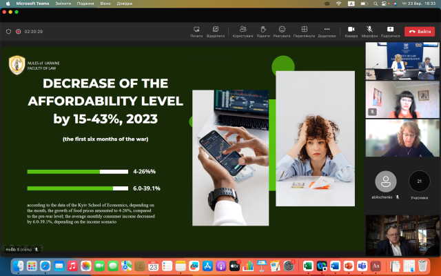 Науковці виступили із доповіддю на тему: «Проблеми правового регулювання продовольчої безпеки України в умовах воєнного стану». Здійснивши аналіз таких критеріїв продовольчої безпеки, як: 1) добова енергетична цінність раціону людини; 2) забезпечення раціону людини основними видами продуктів; 3) економічна доступність продуктів, вони дійшли обґрунтованого висновку щодо порушення конституційного права громадян України на достатній життєвий рівень для себе і своєї сім’ї (ст. 48 Конституції України).