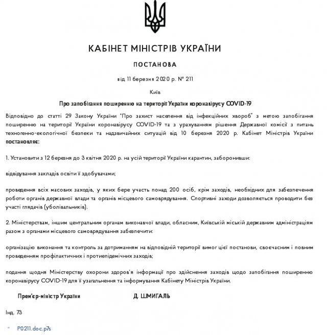 Про запобігання поширенню на території України коронавірусу COVID-19 11 березня 2020 року 02:00 - 02:00