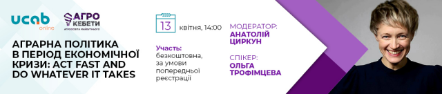 Освітній проект "Агрокебети" спільно з Асоціацією “Український клуб аграрного бізнесу” та агенцією UCABevent запрошують на онлайн-семінар “Аграрна політика в період економічної кризи: Act fast and do whatever it takes”.