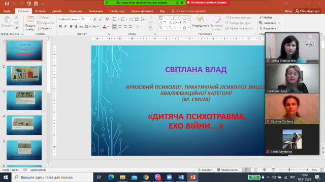 Саме висвітлення актуальності заданої теми «Дитяча психотравма. Ехо війни» спонукала учасників проєкту School of Practical Psychology «Школа практичної психології» кафедри психології долучитись до вебінару кризового дитячого психолога, практичного психолога вищої кваліфікаційної категорії Світлани Влад.