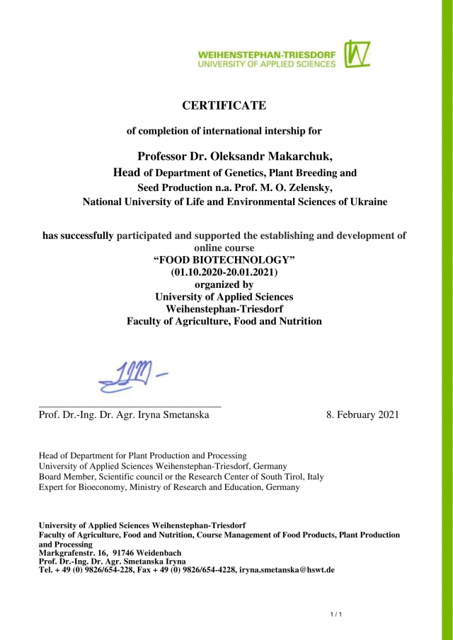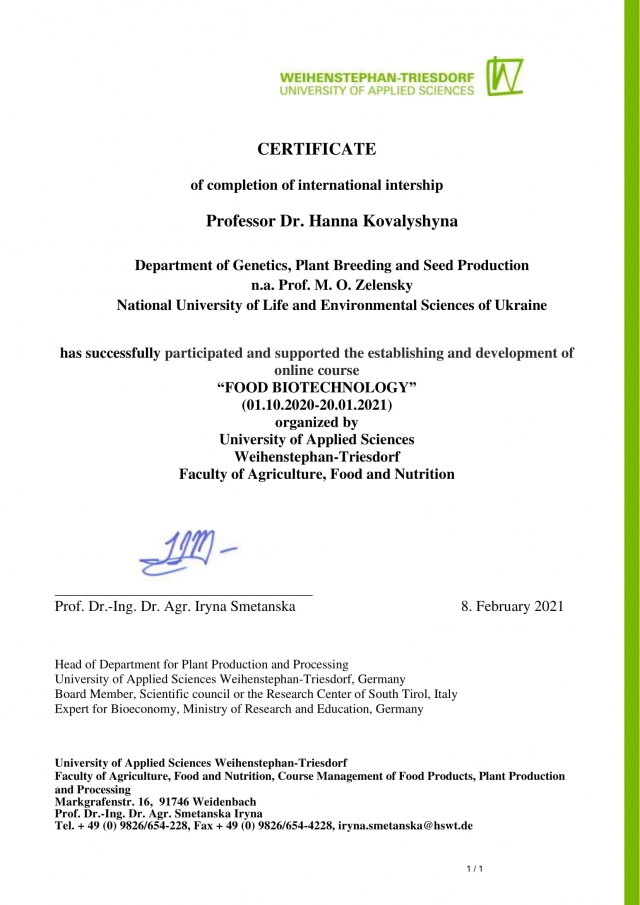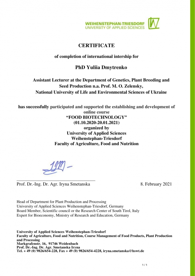 – стажування в закордонних науково-дослідних установах та університетах: інформація з стажування на базі університету Прикладних Наук Вайенштефан-Триздорф, Німеччина «Food biotechnology» включена до курсу «Генетика імунітету рослин проти хвороб і шкідників» проф. Ковалишина Г.М. та використані методи дистанційного навчання під час розроблення та атестації ЕНК (https://elearn.nubip.edu.ua/course/view.php?id=2884); інформація з стажування на базі університету Прикладних Наук Вайенштефан-Триздорф, Німеччина «Food biotechnology» включена до курсу «Ринок сортів і насіння» проф. Жемойда В.Л та ін.
