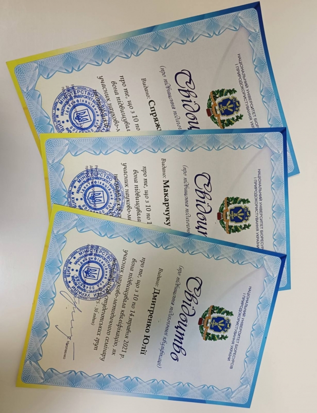- підвищення кваліфікації у вітчизняних науково-дослідних установах та закладах вищої освіти (ННЦ «Інститут землеробства НААН», Інститут біоенергетичних культур та цукрових буряків НААН; Миронівський інститут пшениці імені В. М. Ремесла НААН, Білоцерківський національний аграрний університет та ін.);