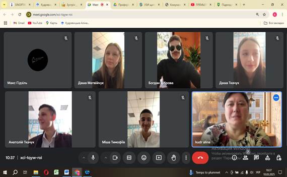 Кудрявицька А.М провела онлайн зустріч 10.03.2025 року із випускниками Комунального закладу «Тиврівській науковий ліцей» Вінницької обласної Ради та Комунального закладу «Жмеринський ліцей №6». Ця зустріч з учнями старших класів відбулися у рамках співпраці між навчальним закладом та НУБіП України з приводу профорієнтаційної роботи, умов вступу та навчання в університеті.