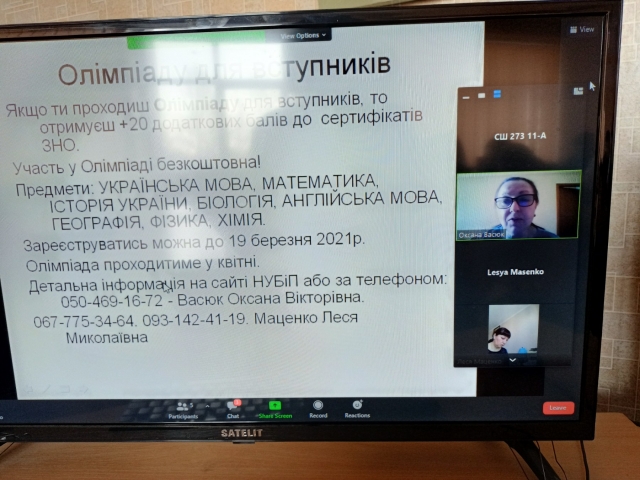 Абітурієнтам була надана вичерпна інформація щодо навчання на підготовчих курсах та участі у олімпіаді в НУБіП України. Якщо абітурієнт проходить підготовчі курси, то отримує +10 додаткових балів до сертифікатів ЗНО. Є можливість отримати підготовку з таких навчальних дисциплін: українська мова та література, математика, хімія, біологія, історія України, іноземні мови, фізика, географія. Курси працюють як очно так і дистанційно. Запис на курси триває до 15 березня 2021 р.
