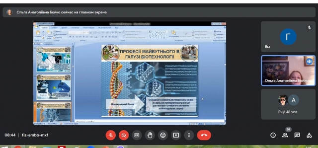 Доцент кафедри фізіології, біохімії рослин та біоенергетики, доктор біологічних наук Бойко Ольга Анатоліївна разом з вчителем біології та хімії Потаповою Галиною Іванівною провели у березні онлайн-зустріч з учнями 11 класів Криворізького ліцею №107 «Лідер» Криворізької міської ради.
