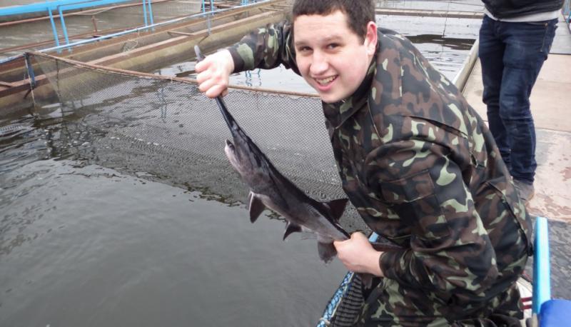 Учасник студентського гуртка «Рибництво» Перванчук Микола тримає дволітка американського веслоноса