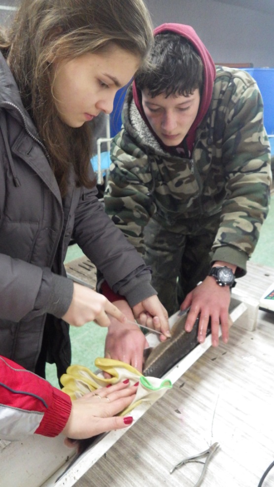 Учасниця студентського гуртка «Рибництво» Приходько Надія робить біопсію проби гонад у самиці стерляді