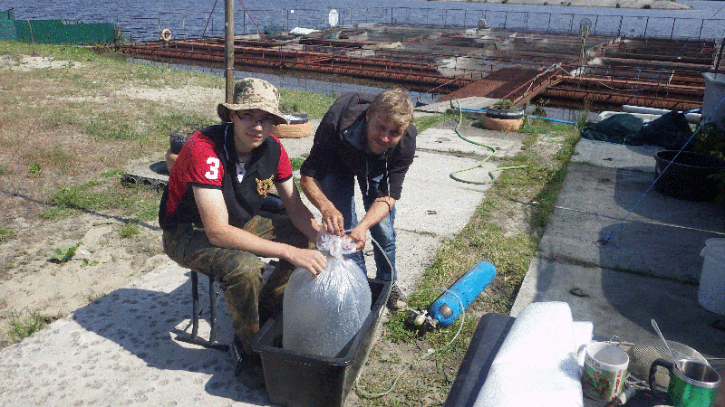 Фото 2. На практиці в ПП "НВФ "Бестер"": упаковка заводських личинок стерляді перед їх транспортуванням