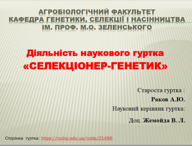 Члени наукового студентського гуртка «Селекціонер-генетик» завдяки проведеній ними ефективної роботи протягом всього навчального року разом з керівником гуртка доц. Жемойдою В. Л. показали результати на досить високому рівні, котрі при наслухування на І етапі Фестивалю студентської науки в Національному університеті біоресурсів і природокористування України зайняли почесне ІІ місце серед всіх гуртків Агробіологічного факультету.