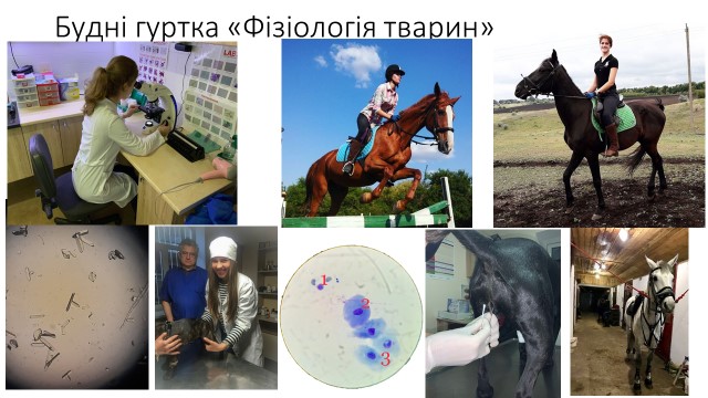 У гуртку «Фізіологія тварин» працюють студенти 2-4 курсів та магістри 1-2 року навчання напряму «Ветеринарна медицина». Робота студентського наукового гуртка здійснюється в теоретичному та експериментальному спрямуванні. Студенти початкових курсів навчання, зазвичай, беруть участь у підготовці доповідей саме теоретичного спрямування, тоді як старшокурсники та магістри вже задіяні в експериментальних наукових дослідженнях кафедри, виконують підготовку експериментальної частини за темою магістерської роботи. Теоретичний та експериментальний напрями охоплюють актуальні питання фізіології тваринного організму, центральної та автономної нервової системи, видові фізіологічні особливості на клітинному та органному рівнях організаціїї. Експериментальні наукові дослідження студентами-гуртківцями проводяться в навчальній лабораторії фізіології тварин, міжкафедральній лабораторії факультету ветеринарної медицини, провідних науково-дослідних установах, кінно-спортивних базах, лікарні ветеринарної медицини “WSW CLINIC” міста Києва, з якими співпрацює кафедра біохімії і фізіології тварин імені академіка М. Ф. Гулого.