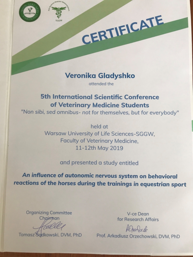 За результатами досліджень підготовлені тези доповідей на конференціїї, наукова робота на Всеукраїнський конкурс студентських наукових робіт На конкурс була представлена робота «Умовно-рефлекторна діяльність коней з різним тонусом автономної нервової системи», науковий керівник: доцент кафедри біохімії і фізіології тварин імені академіка М. Ф. Гулого, доктор ветеринарних наук Лариса Кладницька. Член гуртка «Фізіологія тварин», студентка 4 курсу 4 групи Вероніка Гладишко виборола 7 місце на Всеукраїнському конкурсі студентських наукових робіт у галузі знань 21 «ветеринарна медицина», спеціальності 211 «ветеринарна медицина» у 2019-2020 навчальному році. Керівник гуртка «Фізіологія тварин» – доцент кафедри біохімії і фізіології тварин імені академіка М. Ф. Гулого, доктор ветеринарних наук Лариса Кладницька.