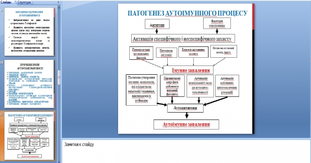 Вивчали основи автоімунних процесів, де лежать імунні реакції: ІІ типу (цитотоксичні); ІІІ типу імунокомплексні); IV типу (лімфоцитотоксичні (ГСТ); V типу – реакції з рецепторними структурами.