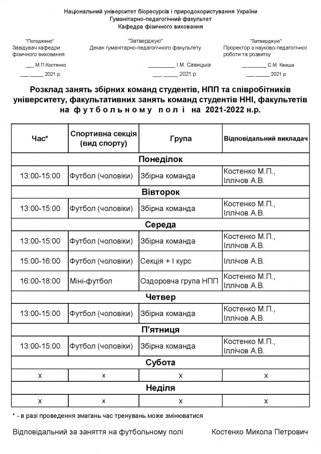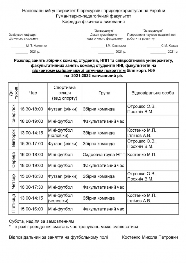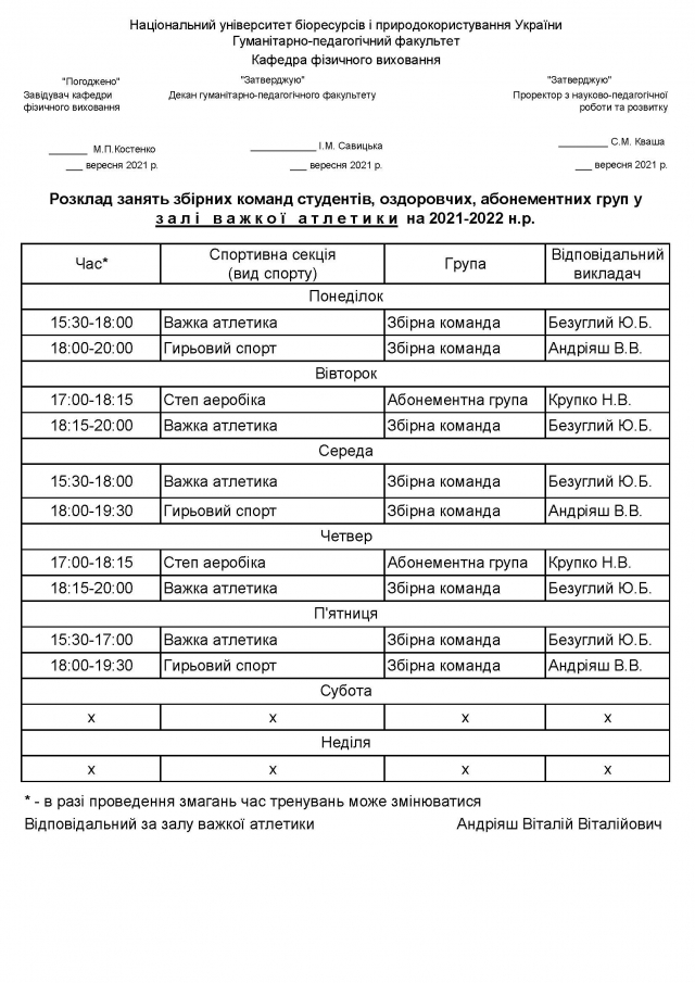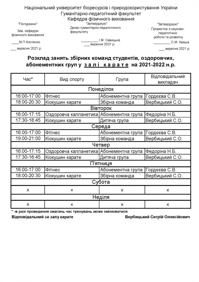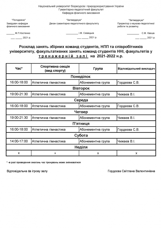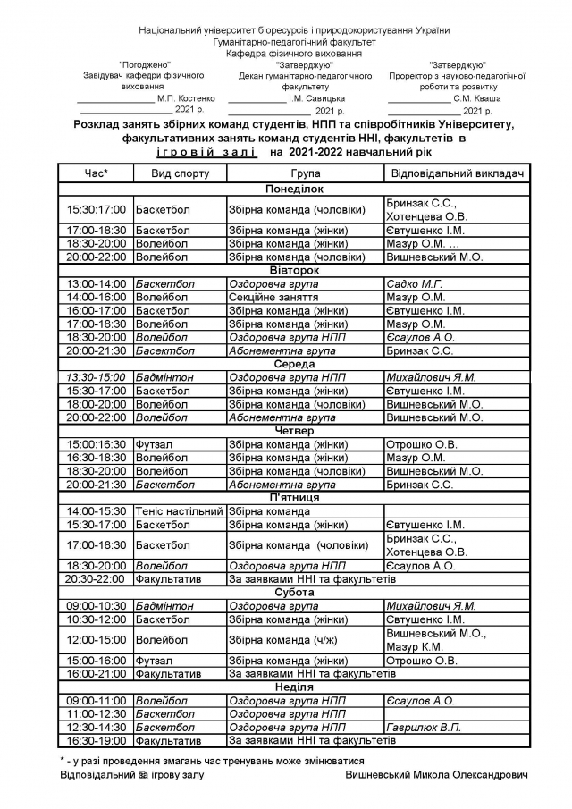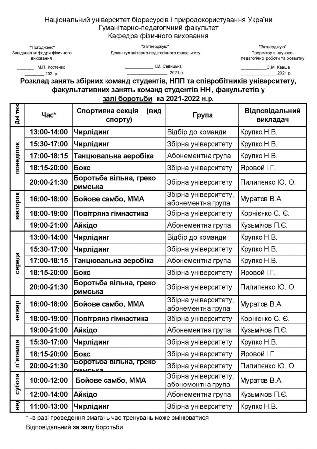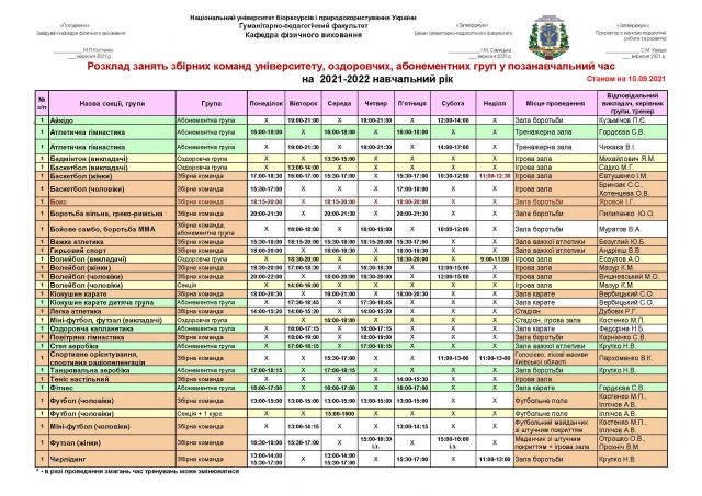 Розклад занять у спортивних, оздоровчих секціях, абонементних групах студентів, НПП НУБіП України на 2021-2022 навчальний рік