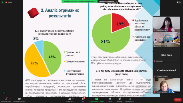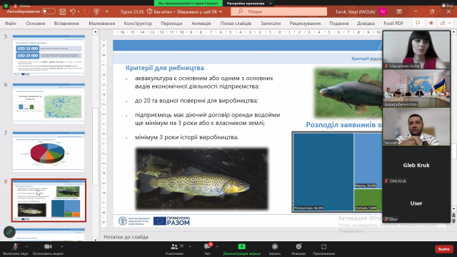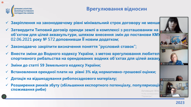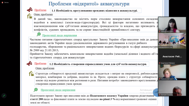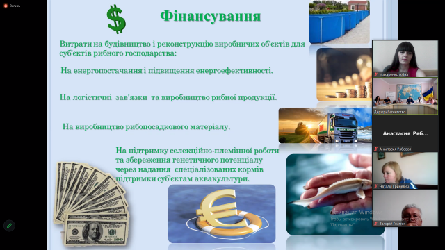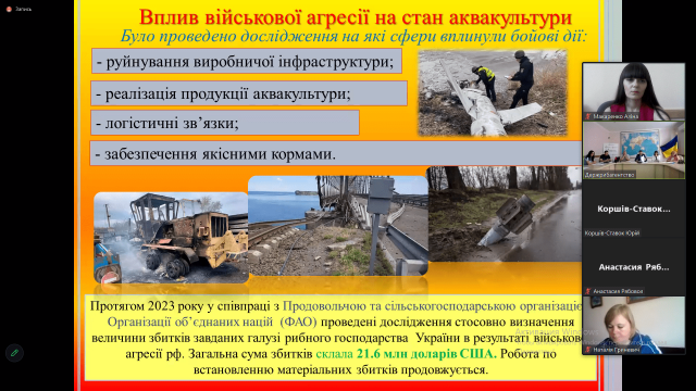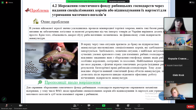 Під час заходу обговорили актуальні питання української аквакультури з метою пошуку напрацювання шляхів її розвитку відповідно до загальноєвропейських тенденцій. Зокрема, концепції відновлення аквакультури в Україні, змін у законодавстві щодо оренди гідротехнічних споруд, подолання наслідків військової агресії рф, досвід запровадження грантових програм в українській аквакультурі тощо.