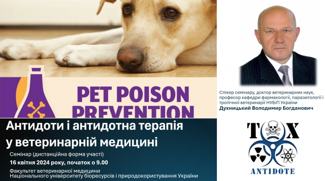 Кафедра фармакології, паразитології і тропічної ветеринарії факультету ветеринарної медицини НУБіП України запрошує всіх бажаючих до участі у семінарі «Антидоти і антидотна терапія у ветеринарній медицині». Семінар розрахований на фахівців ветеринарної медицини ветеринарних клінік, студентів факультетів ветеринарної медицини, власників тварин та інших зацікавлених осіб.