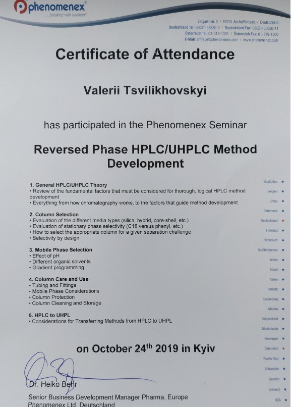 Доцент кафедри біохімії і фізіології тварин ім. акад. М.Ф. Гулого Валерій Цвіліховський 24 жовтня 2019 року взяв участь в семінарі «Розробка методів високоефективної рідинної хроматографії», який читав доктор Хайко Бер (старший менеджер з розвитку бізнесу в Європейській фармацевтичній галузі).