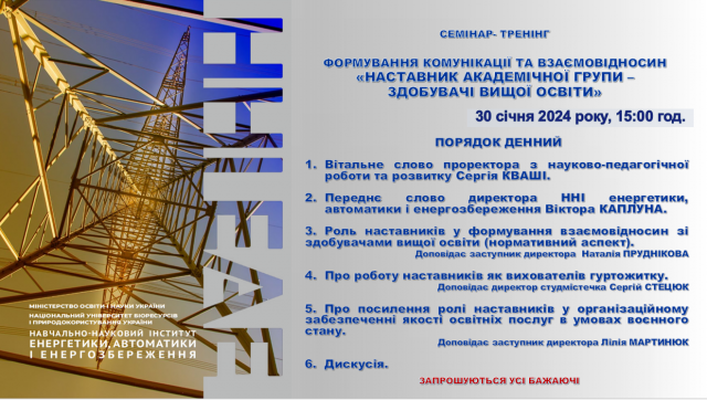 Семінар –тренінг «ФОРМУВАННЯ КОМУНІКАЦІЇ ТА ВЗАЄМОВІДНОСИН «НАСТАВНИК АКАДЕМІЧНОЇ ГРУПИ – ЗДОБУВАЧІ ВИЩОЇ ОСВІТИ» Щоб приєднатися до відеозустрічі, натисніть посилання 24 січня 2024 року 02:00 - 02:00