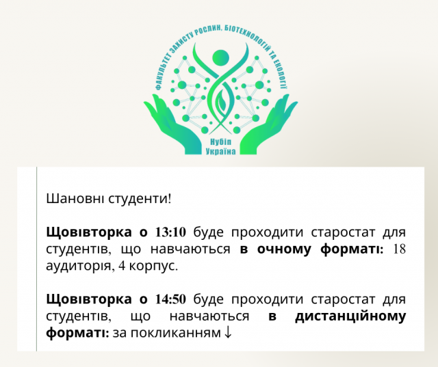 Щовівторка на факультеті захисту рослин, біотехнологій та екології буде проходити СТАРОСТАТ, читайте деталі. Покликання на зустріч > 5 жовтня 2023 року 03:00 - 03:00