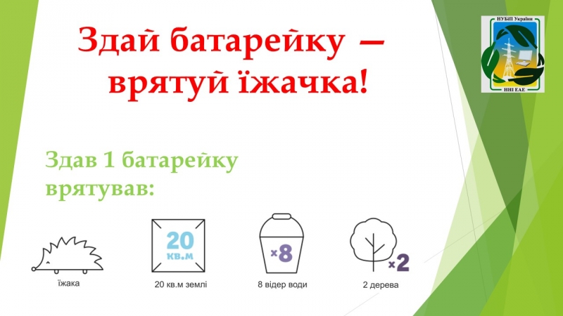 НУБіП України не стоїть осторонь даного питання. У жовтні 2017 року ННІ енергетики, автоматики і енергозбереження розпочинає на постійній основі соціальний проект по збору відпрацьованих джерел живлення «Здай батарейку – врятуй їжачка!».