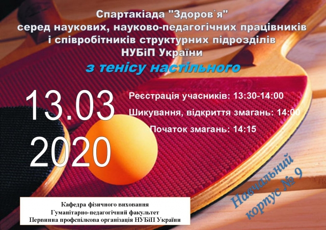 Спартакіада «Здоров’я» серед науково-педагогічних, наукових працівників і співробітників базового підрозділу НУБіП України 2019-2020 навчального року з тенісу настільного