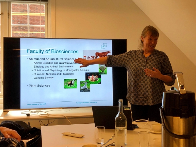 Метою візиту було обговорення можливостей співпраці по спільному гранту з питань селекції та генетики в молочному скотарстві. Інтереси наших норвезьких колег представляли Трігве Солберг – представник компанії ,,Гено-глобал”, Амунд Маклебаст- координатор проекту, Бьорг Херінгстад - професор підрозділу з розведення та кількісної генетики факультету біологічних наук університету.