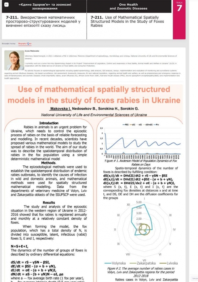 Use of Mathematical Spatially Structured Models in the Study of Foxes Rabies. Makovska I., Nedosekov V., Sorokina H., Sorokin G. Qualitative Risk Assessment of the Rabies Spread among Domestic and Wild Animals in Ukraine. Polupan I., Nedosekov V., Korniienko L., Romanenko O., Trotskyi M., Chuzhakina K., Lets V., Shevchenko O.