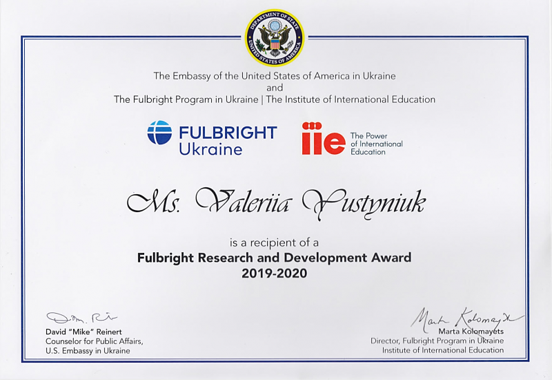 14 червня 2019 р. в Посольстві США в Україні відбулась церемонія нагородження стипендіатів Програми Фулбрайта, яка спонсорується урядом США та адмініструється Інститутом Міжнародної Освіти (IIE). За час існування Програми в Україні з 1992 року – понад 1000 українців навчалися, стажувалися, проводили дослідження у США; більше 700 американців викладали в українських вищих навчальних закладах і займались науковою працею.