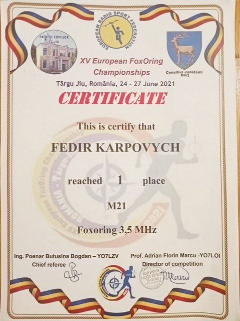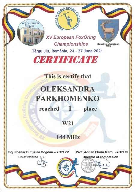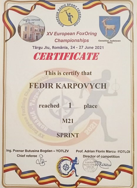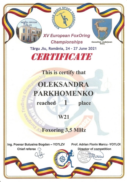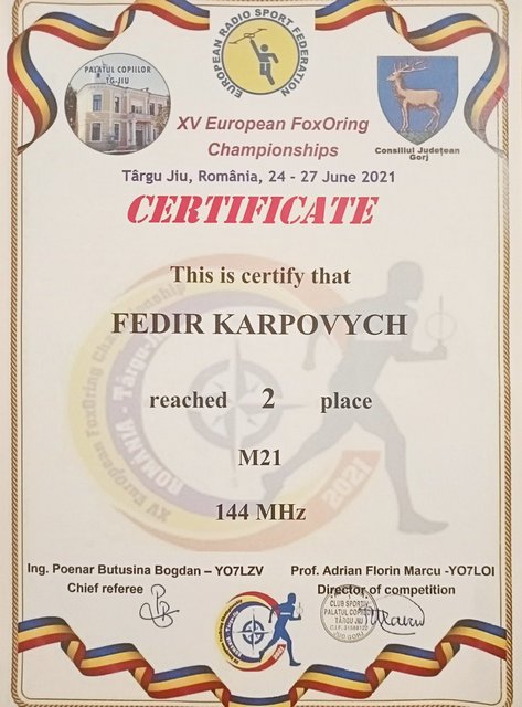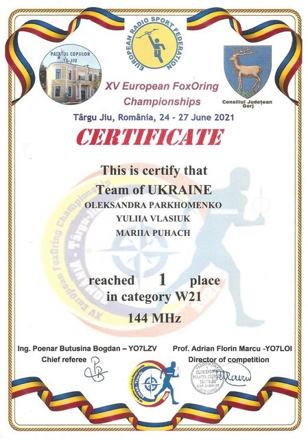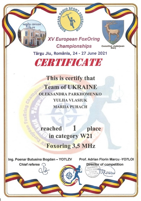 27-29 вересня 2019 року в околицях міста Тиргу-Жіу Республіка Румунія Європейська федерація радіоспорту провела змагання 15-го чемпіонату Європи зі спортивного радіоорієнтування.