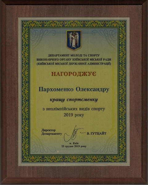 А тим часом надійшла приємна звістка з Київської міської державної адміністрації. За результатами виступів на чемпіонатах, кубках світу, Європи, України кожного року в Києві визначають кращих спортсменів і тренерів. Однією з кращих спортсменів Києва 2019 року з неолімпійських видів спорту визнано Олександру Пархоменко, заслуженого майстра спорту України з радіоспорту, майстра спорту України зі спортивного орієнтування. Вручення відзнак відбудеться 23 грудня 2019 року в IQ бізнес-центрі (Печерськ, м. Київ). Олександра вже третій рік поспіль удостоюється цієї відзнаки, що є високим досягненням спортсменки нашого університету!