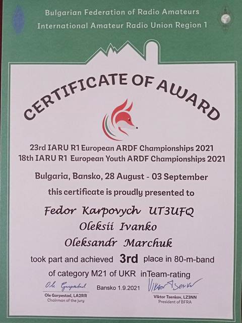 У змаганнях серед чоловіків 3 місце на чемпіонаті Європи у дисципліні з пошуку «лис» на діапазоні 3,5 МГц в складі збірної команди України зайняв Федір Карпович – студент 3 курсу факультету інформаційних технологій, кращий результат на кубку Європи Федір показав на дистанції спринту – 5 місце. Федір - вчорашній юніор, зумів ра зезультатами відбору протягом 2021 року увійти до трійки спортсменів дорослої збірної команди України на участь у чемпіонаті Європи луше у 1 дисципліні з чотирьох, але для молодого спортсмена і таке досягнення великий успіх, бо у спортивній радіопеленгації досвід спортсмена дуже сильно впливає на результат і переможцями і призерами міжнародних змагань серед дорослих у елітних групах серед чоловіків і жінок Ч/Ж21 стають спортсмени, яким за віком 30, 40 і навіть старші за 50 років.