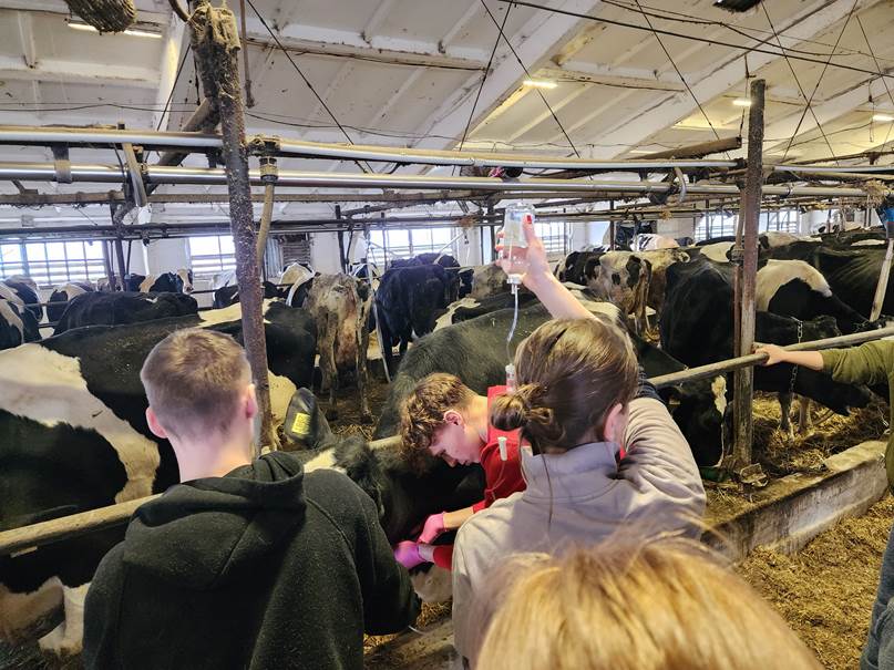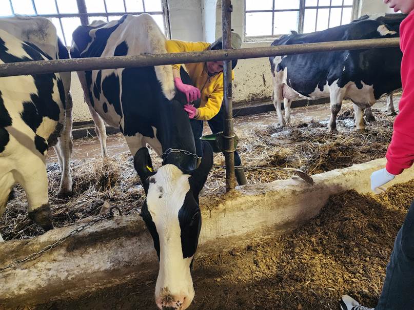 умовах. Майбутні лікарі ветеринарної медицини відпрацьовували методи клінічного обстеження тварин, навчалися виявляти хворих тварин у стаді, встановлювати діагноз та призначати лікування. У роботі застосовувалися різні методи діагностики, зокрема загальноклінічні, інструментальні та лабораторні. Студенти також відпрацьовували практичні навички введення ветеринарних препаратів різними шляхами – підшкірно, внутрішньом’язово, внутрішньовенно та іншими методами. Окрему увагу було приділено застосуванню аерозольтерапії та дотриманню принципів безпечної й гуманної фіксації тварин під час проведення лікувально-діагностичних процедур. Важливим елементом практики стало проведення диспансеризації поголів’я та оцінка клінічного стану стада, що дозволяє своєчасно виявляти патології та запобігати поширенню захворювань. Проведення навчальної практики у виробничих умовах сприяє формуванню клінічного мислення у студентів, розвитку професійних компетентностей та кращому розумінню специфіки роботи лікаря ветеринарної медицини в сучасних тваринницьких господарствах.