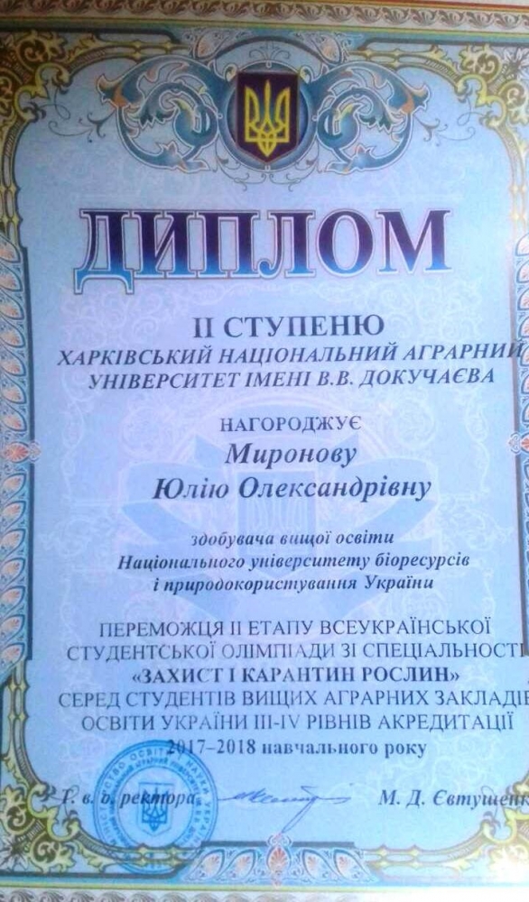 Студенти факультету захисту рослин, біотехнологій та екології - призери заключного етапу Всеукраїнської студентської олімпіади зі спеціальності "Захист і карантин рослин"