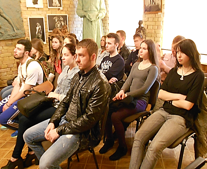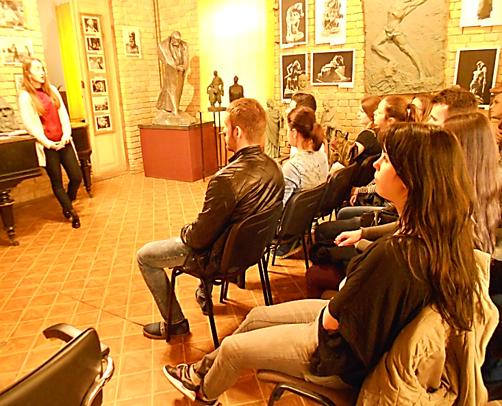 Студенти із зацікавленістю слухали розповідь екскурсовода про життєвий шлях та творчість скульптора, милувалися скульптурами, фотографіями, рукописами сценаріїв і п’єс видатного майстра.