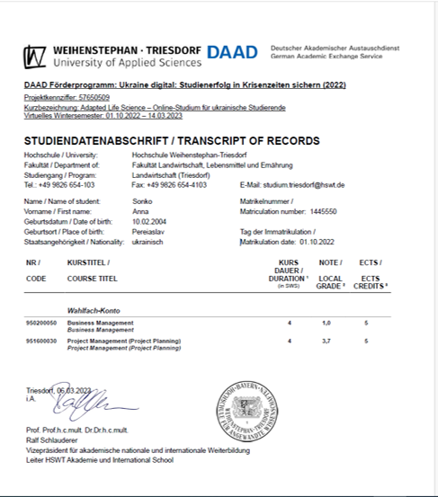 Програма передбачала стипендії для студентів різних курсів в рамках проекту «Україна цифрова: забезпечення академічної успішності під час кризи». Студенти НУБіП були зараховані як студенти за академічним обміном до Університету Вайєнштефан-Тріздорф (Німеччина) для дистанційного навчання на період вересень-грудень 2022 року. В рамках проекту студенти мали обрати та опанувати декілька дисциплін обсягом 10-30 ECTS, які викладатимуться англійською та (окремі) українською мовами.