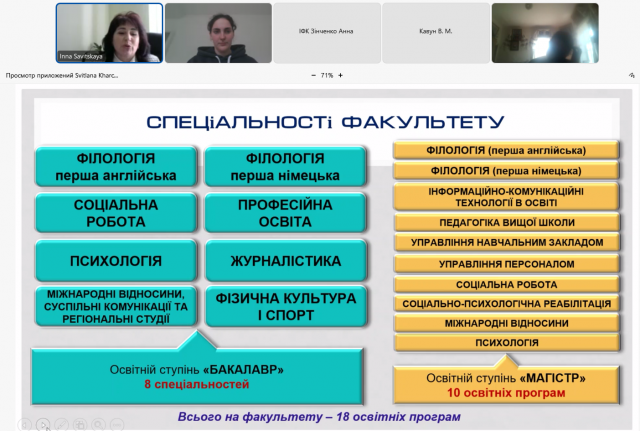 Про те, що саме цей факультет найкращий, щиро, переконливо і актуально у першій презентації пояснила декан факультету доцент Інна Миколаївна Савицька. Вона представила багатство, різноманітність і престижність спеціальностей, якими можна оволодіти на факультеті, охарактеризувала міжнародні програми, можливості стажування за кордоном і отримання подвійних дипломів, які мають наші студенти, показала (хоч і віртуально) матеріально-технічну базу факультету, розповіла про центри і лабораторії, у яких навчаються майбутні бакалаври і магістри.
