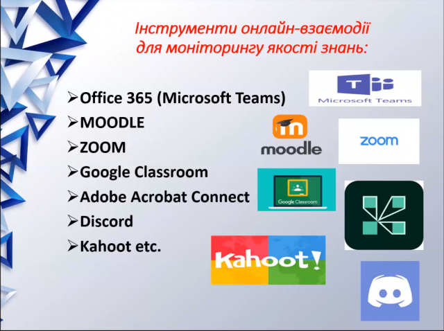 Дистанційне навчання в університетах України, як і в більшості закордонних, відбувається через спеціальні навчальні платформи, а саме: Moodle, Microsoft teams, Google Classroom. Такі навчальні портали є доволі зручними, оскільки завдяки ним студенти можуть проходити тести, знаходити лекційні матеріали та підтримувати зв’язок із викладачами. Для проведення лекцій в онлайн-режимі використовують програми Zoom Meeting, Discord, Google Meet, Webex та інші комунікаційні технології. Найбільшою проблемою вітчизняних платформ для дистанційного навчання є те, що немає єдиного інструменту або майданчику, який би вирішував усі задачі. Так, наприклад, для проведення тестів викладачі НУБіП України користуються платформою Moodle, а онлайн-пари проходять в Zoom, Google Meet чи Webex.