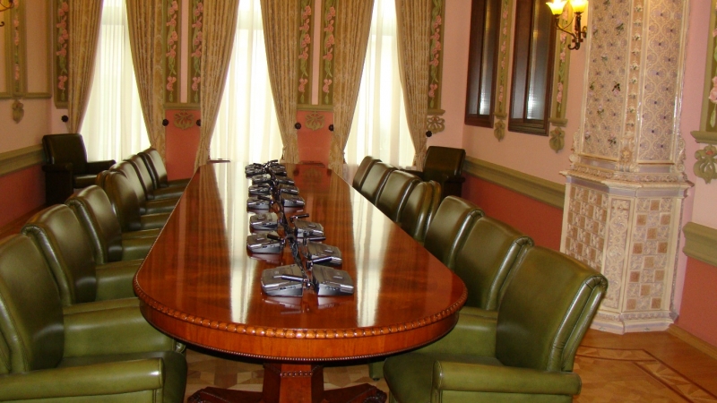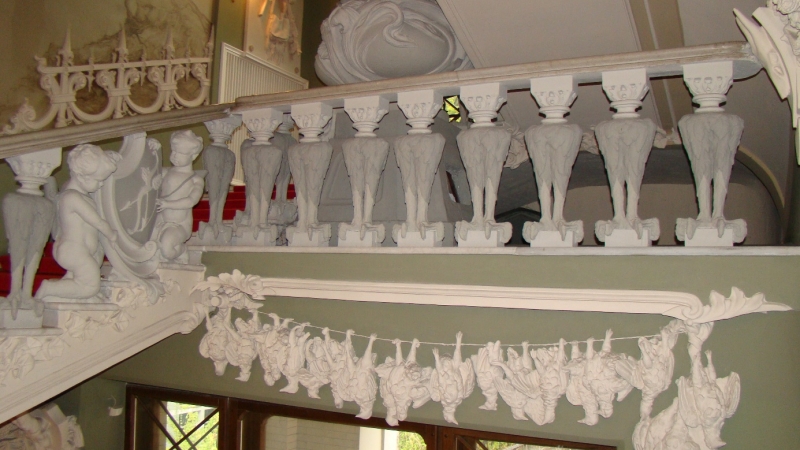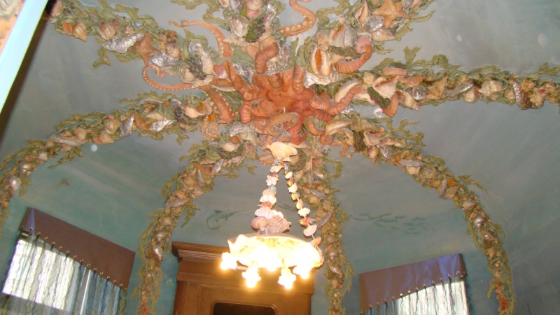 Внутрішнє оздоблення ні в чому не поступається екстер’єру. Інтер’єр ґрунтується на чудернацьких художніх розписах, ліпнинах та різьблених прикрасах. Захоплюють погляд туристів мисливські ліпні мініатюри, які розташувались вздовж сходів. На стінах повсюдно можна побачити фризи з екзотичних рослин, квітів і фруктів (найчастіше трапляються ананаси), поміж яких зображено велетенські, могутні черепи оленів і лосів. Дуже часто трапляються справжні мисливські атрибути: велетенські роги, страшенні черепи й різноманітні опудала. Одразу біля входу відвідувачів лякає спрут. А в самому центрі залу знаходиться світильник-торшер. Його зроблено у вигляді двох величезних риб, які підняли свої хвости догори. Вони сповиті морськими та океанічними водоростями, а також квітами лотоса. На стінах висять чудові плафони, прикрашені фруктами: виноградом, ананасами, а також різнобарвними квітами та водоростями. Розетки для плафонів зроблені у формі морських зірок.
