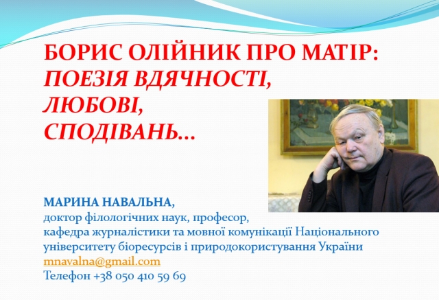 А доктор філологічних наук, професор, професор кафедри журналістики та мовної комунікації Національного університету біоресурсів та природокористування України Марина Іванівна Навальна у доповіді «Борис Олійник про матір: поезія вдячності, любові, сподівань» висловила думку, що такі ніжні слова про Матір, як ті, що народилися з-під пера Бориса Олійника, мало кому вдавалося відшукати, бо поезії про матір у Бориса Олійника найщемкіші, найліричніші, вони стали пісенними перлами української культури.