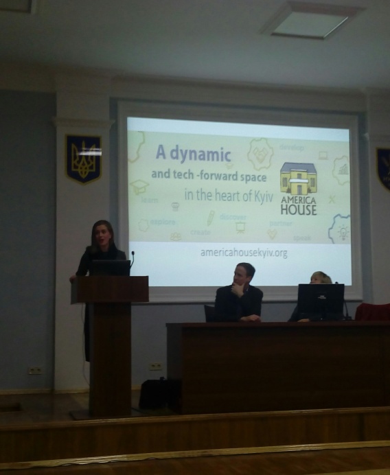 Крісті Енн Хофланд, директор Американського дому (America House) в Києві, розповіла про його діяльність, яка не тільки сприяє розвиткові професійного й особистого потенціалу кожного відвідувача, а і спрямована на взаєморозуміння та співпрацю між українцями й американцями на підставі спільних цінностей. Шановна гостя запросила всіх присутніх відвідати заходи, які проводяться в Американському домі.
