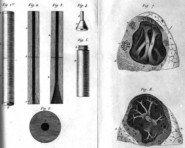 Само собою, згорнутим аркушем довго було користуватися не можна, і Лаеннек був стурбований створенням більш довговічного приладу. Він перепробував безліч матеріалів від очерету до каштана, поки не зупинився на горіховому дереві (Сам стояв за токарним верстатом!). Свій винахід він назвав «Le Cylindre» - «циліндр», який мав довжину 12 дюймів (близько 30 см) і діаметр 1,5 дюйма (близько 4 см).