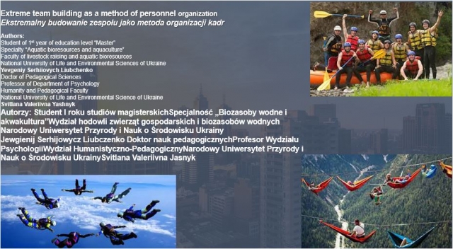Від Національного університету біоресурсів та природокористування України на цій конференції виступив Євгеній Любченко, магістр 1 року навчання факультету тваринництва та водних біоресурсів. Ним було представлено досить цікаву та неординарну для українських реалій тему «Екстремальне командоутворення як метод організації персоналу».