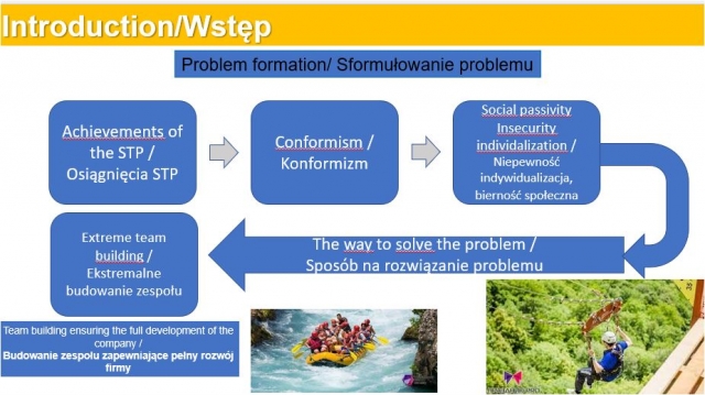 Під час представлення доповіді було наведено класифікацію екстремальних тимбілдингів (створення та підвищення ефективності командної роботи) та наведено детальний опис їх різновидів, зокрема корпоративні пригодницькі перегони, квести, ігри на виживання в стилі телепрограми «Останній герой» та дайвінг тощо.