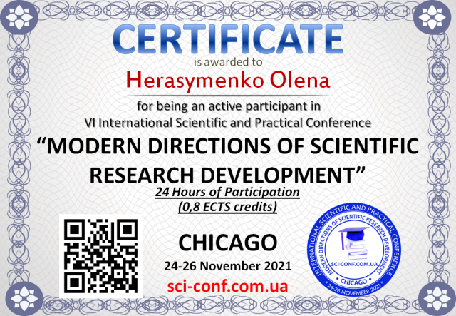 Олена Герасименко долучилася до роботи VI міжнародної науково-практичної конференції «Сучасні напрями розвитку наукових досліджень», яка відбулася 24-26 листопада в м. Чікаго, США.